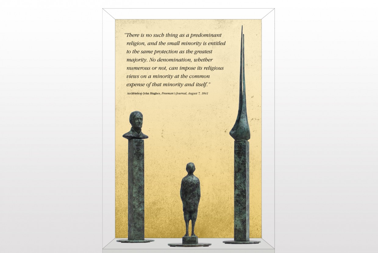 When the exhibit moved to Old St. Patrick’s we designed a display case with maquettes of the Archbishop Hughes bicentennial sculptures by Irish artist, Rowan Gillespie.