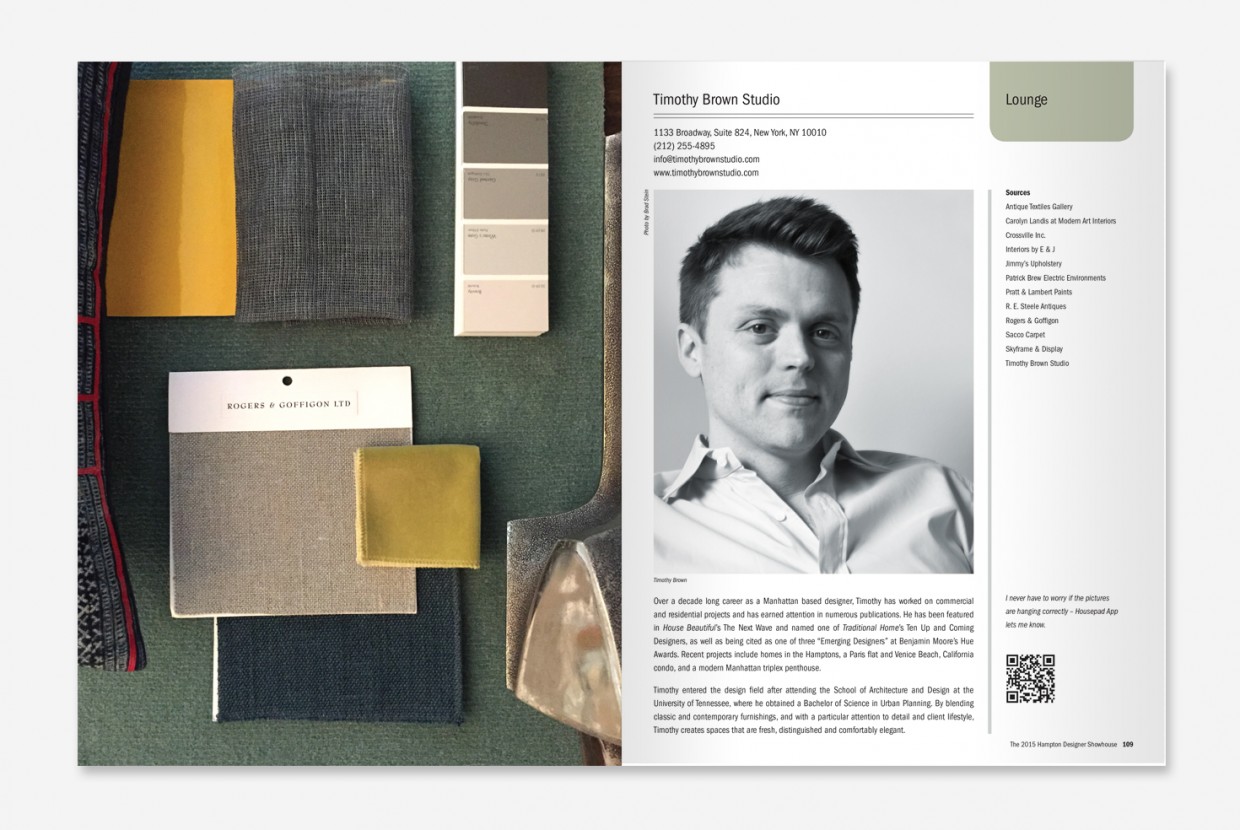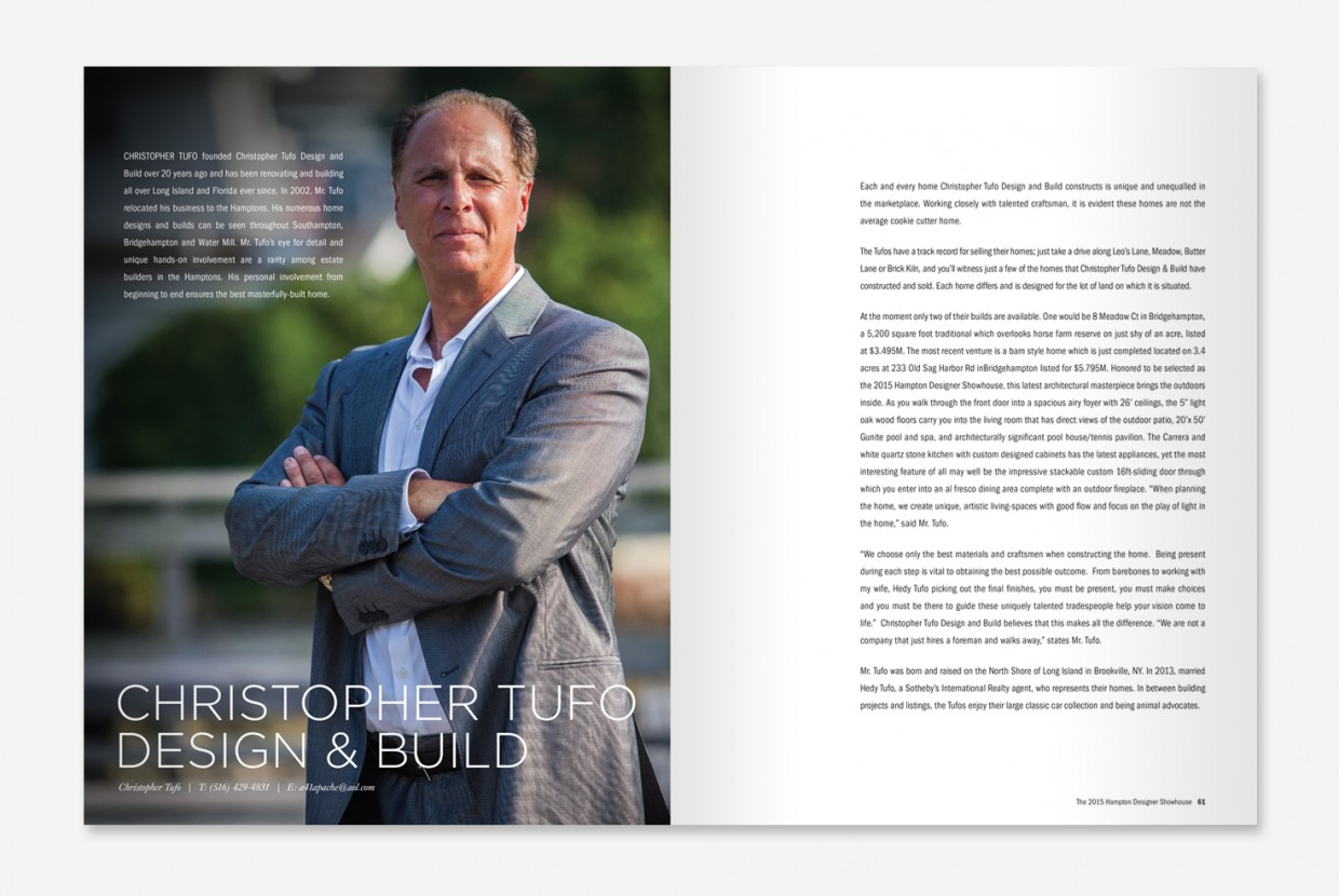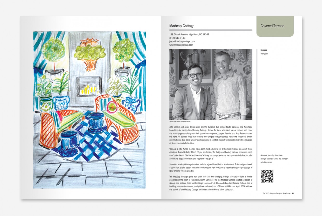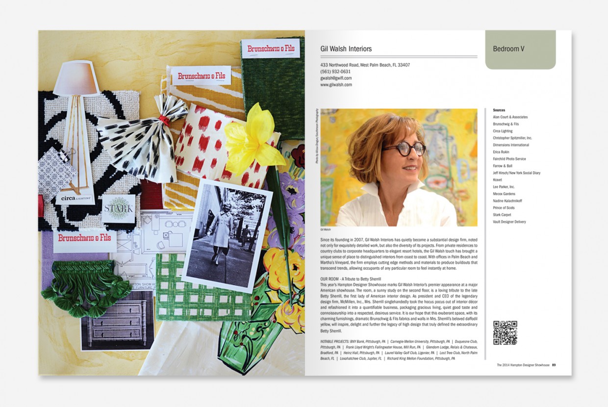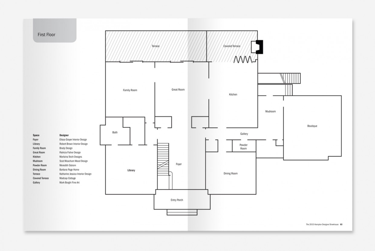 A great deal of work goes into the production of each journal. We work closely with the Hampton Designer Management Team and the many interior designers involved, to ensure a beautiful keepsake. Each designer receives a 2-page spread to showcase a rendering of their room, a short bio with headshot, their contact information and a list of sources used. All supplied photos are expertly retouched, montages are created and detailed floor plans are generated for the multi-level houses. In addition, we design many of the journals’ advertisements.