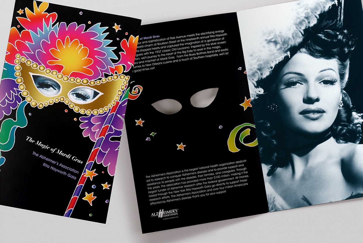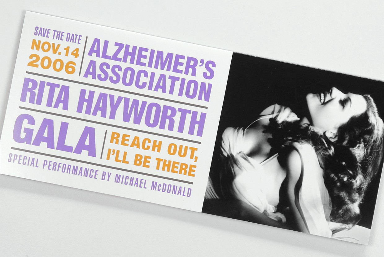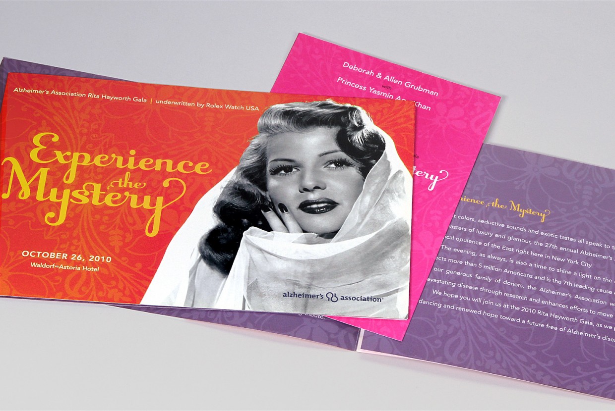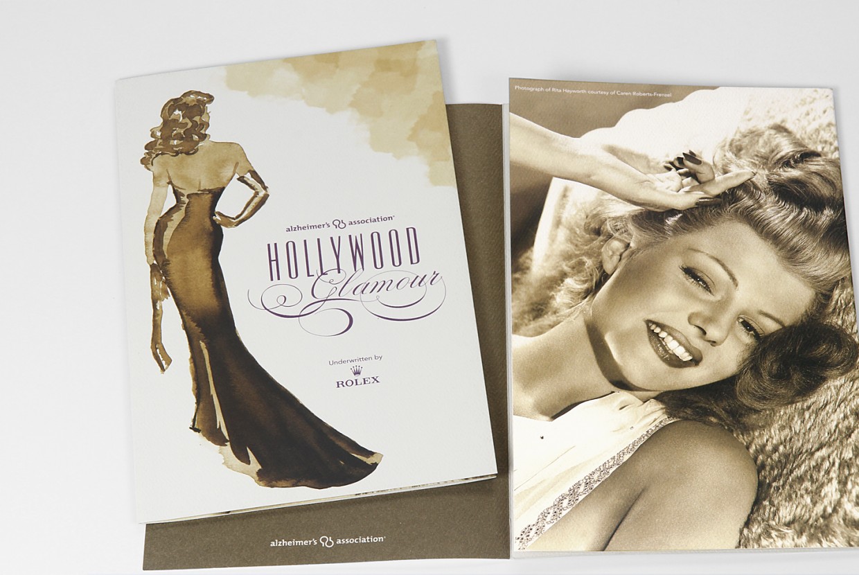 For the Alzheimer’s Association Rita Hayworth Gala, we worked with a theme selected from one of the star’s movies utilizing a variety of print finishes – such as embossed foil stamping, glitter UV, and die-cutting – and specialty papers to enhance the invitation design.