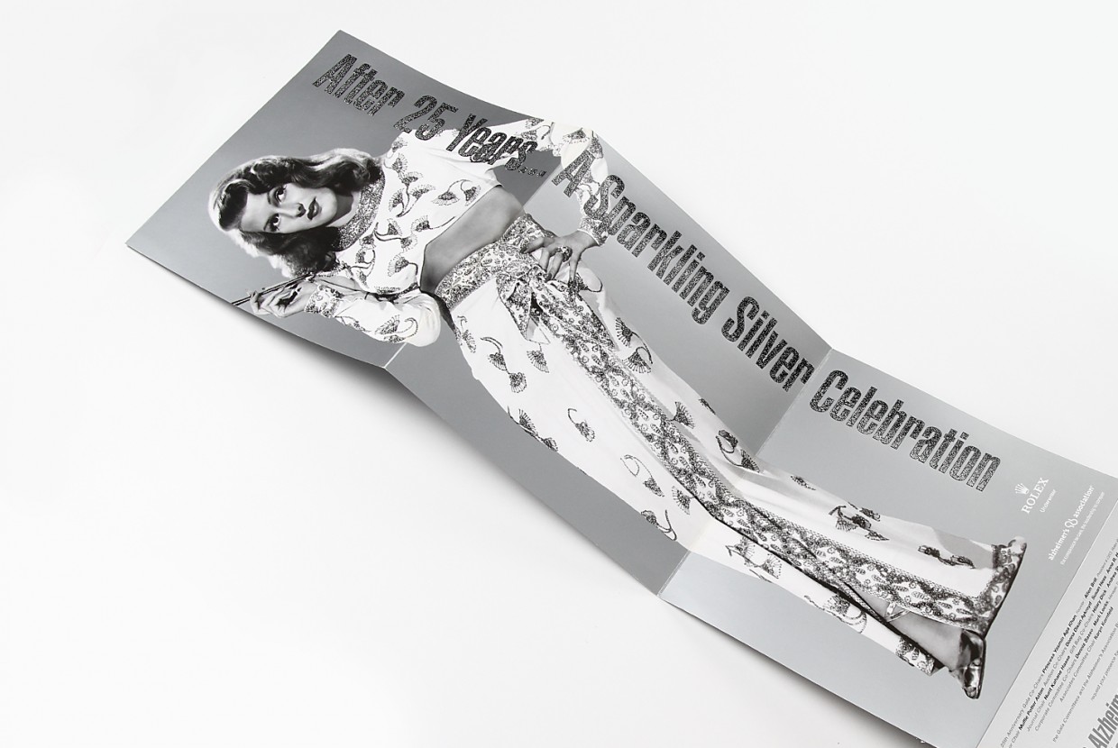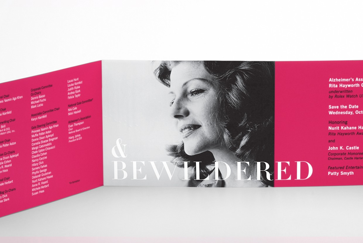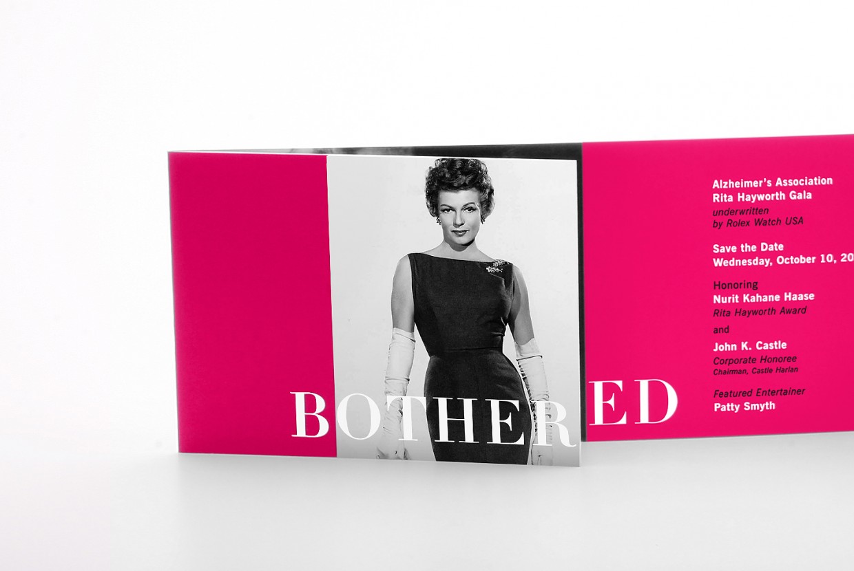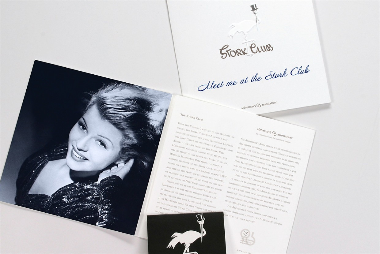 For the Alzheimer’s Association Rita Hayworth Gala, we worked with a theme selected from one of the star’s movies utilizing a variety of print finishes – such as embossed foil stamping, glitter UV, and die-cutting – and specialty papers to enhance the invitation design.